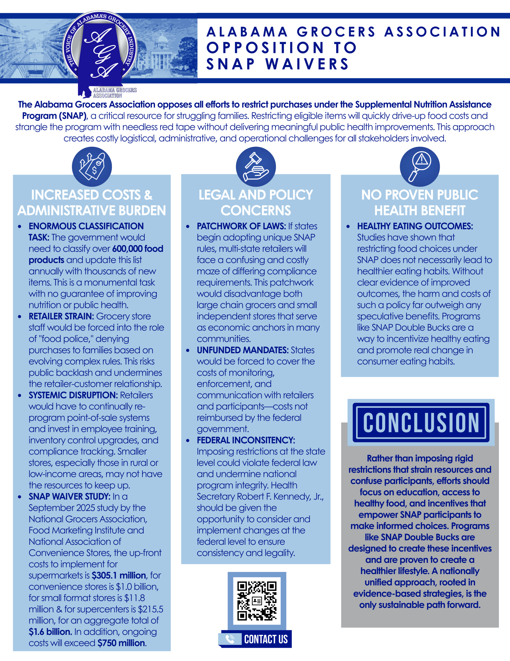 The Alabama Grocers Association (AGA) is the voice of the grocery industry and actively monitors federal and state activity related to SNAP Food Restriction Waivers and their potential impact on the grocery industry.