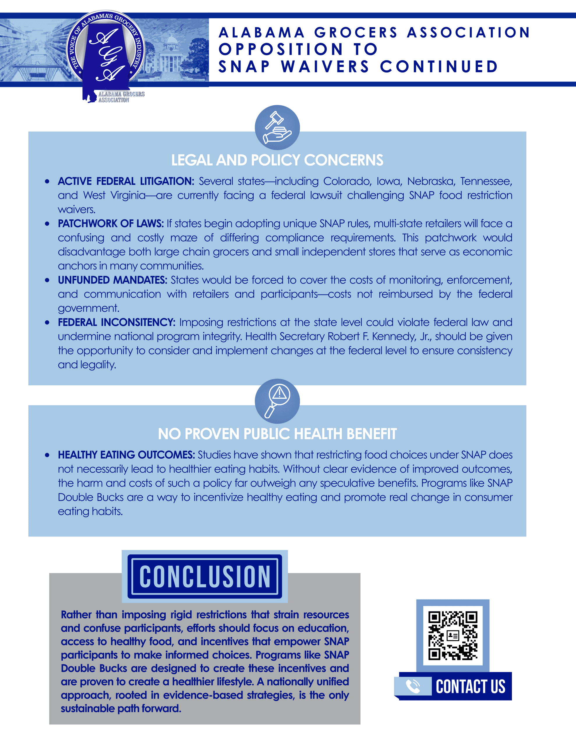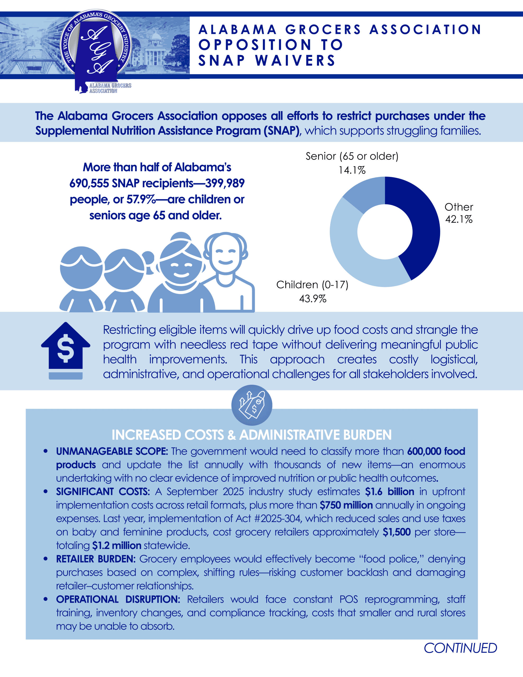 The Alabama Grocers Association (AGA) is the voice of the grocery industry and actively monitors federal and state activity related to SNAP Food Restriction Waivers and their potential impact on the grocery industry.